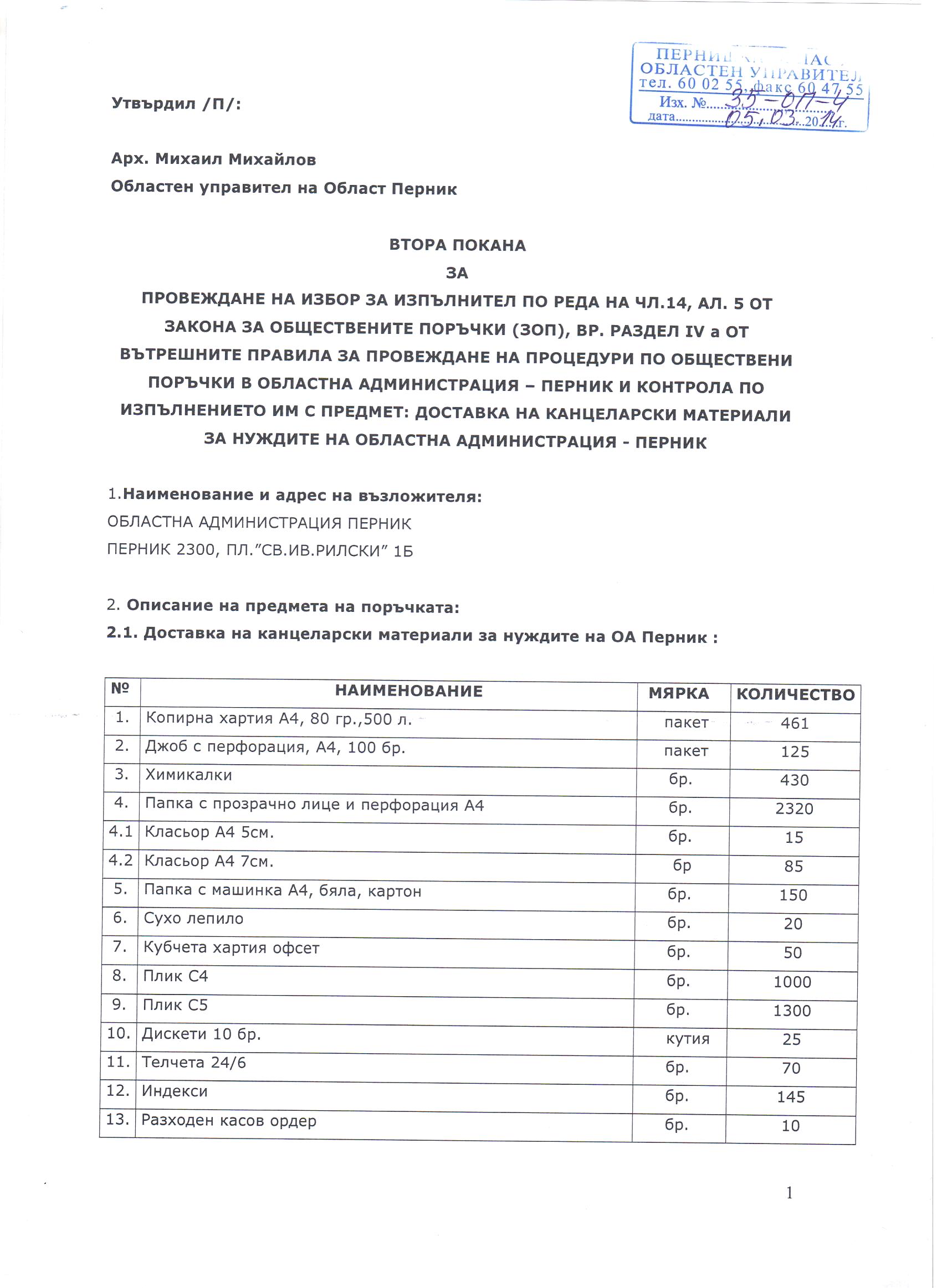 ЗА ПРОВЕЖДАНЕ НА ИЗБОР ЗА ИЗПЪЛНИТЕЛ ПО РЕДА НА ЧЛ.14, АЛ. 5 ОТ ЗАКОНА ЗА ОБЩЕСТВЕНИТЕ ПОРЪЧКИ (ЗОП), ВР. РАЗДЕЛ IV a ОТ ВЪТРЕШНИТЕ ПРАВИЛА ЗА ПРОВЕЖДАНЕ НА ПРОЦЕДУРИ ПО ОБЩЕСТВЕНИ ПОРЪЧКИ В ОБЛАСТНА АДМИНИСТРАЦИЯ – ПЕРНИК И КОНТРОЛА ПО ИЗПЪЛНЕНИЕТО ИМ С ПРЕДМЕТ: ДОСТАВКА НА КАНЦЕЛАРСКИ МАТЕРИАЛИ ЗА НУЖДИТЕ НА ОБЛАСТНА АДМИНИСТРАЦИЯ - ПЕРНИК